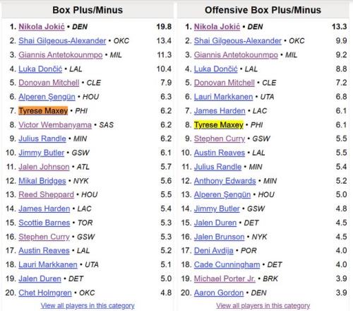 BBR的高阶数据,马克西的PER值、WinShare、VORP(不可替代值)、BPM分别排在联盟第12、第7、第6、第7,多项数据后面跟的还是库里、文班这样的大佬。