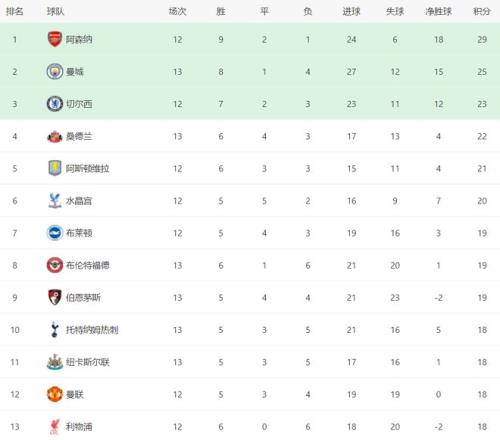 在积分榜上,阿森纳以29分排名榜首。曼城赢球之后,总积分达到25分,升到了第2名。切尔西23分排名第3。第4的是桑德兰,拿到22分。阿斯顿维拉以21分排名第5。水晶宫20分排名第6。热刺只拿到18分,排名第10。纽卡斯尔联、曼联、利物浦和埃弗顿这些球队也都是18个积分。